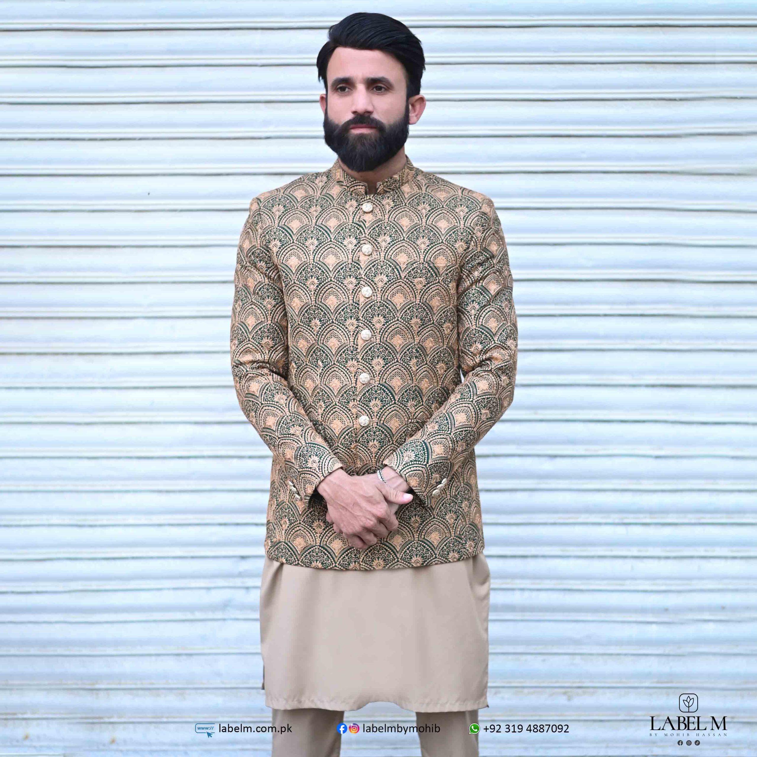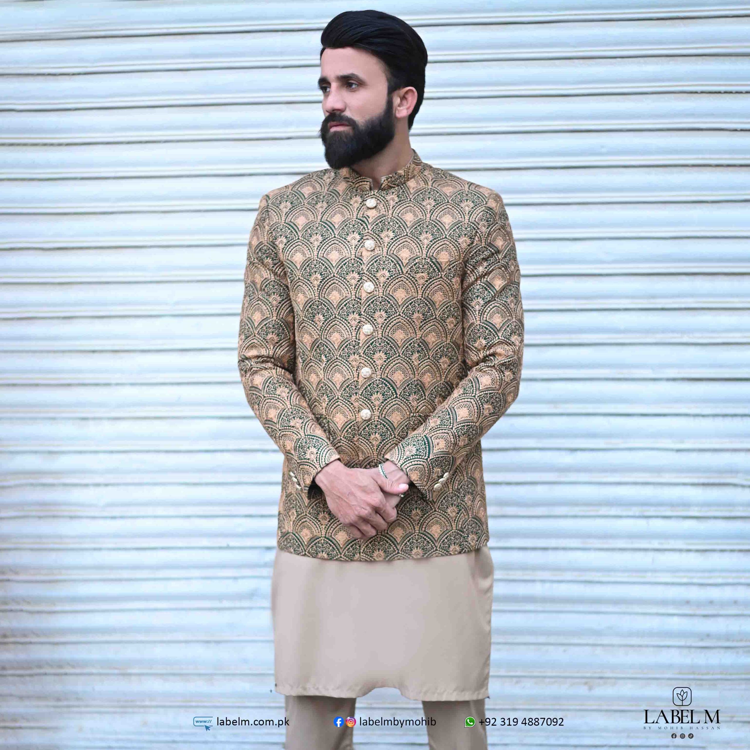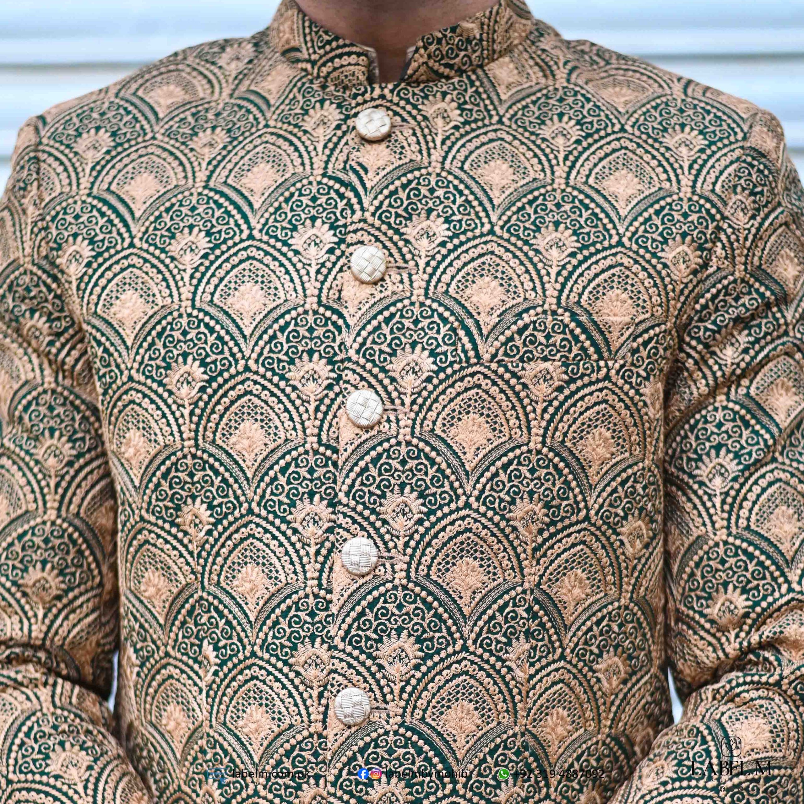 Embrace sophistication with this stunning dark green and fawn embroidered prince coat, Embroidered with intricate fawn detailing, the coat showcases a unique blend of colors that enhances its visual appeal.