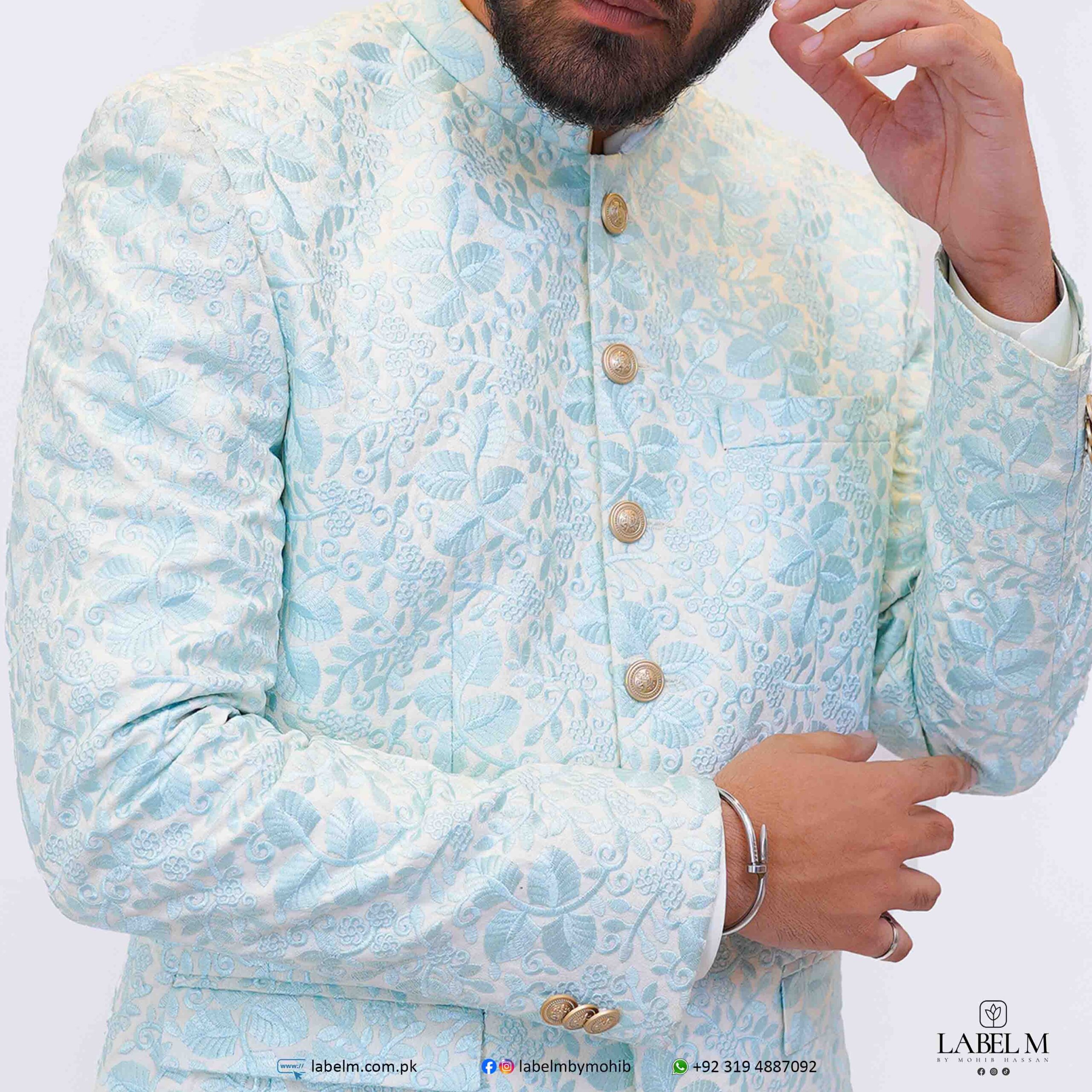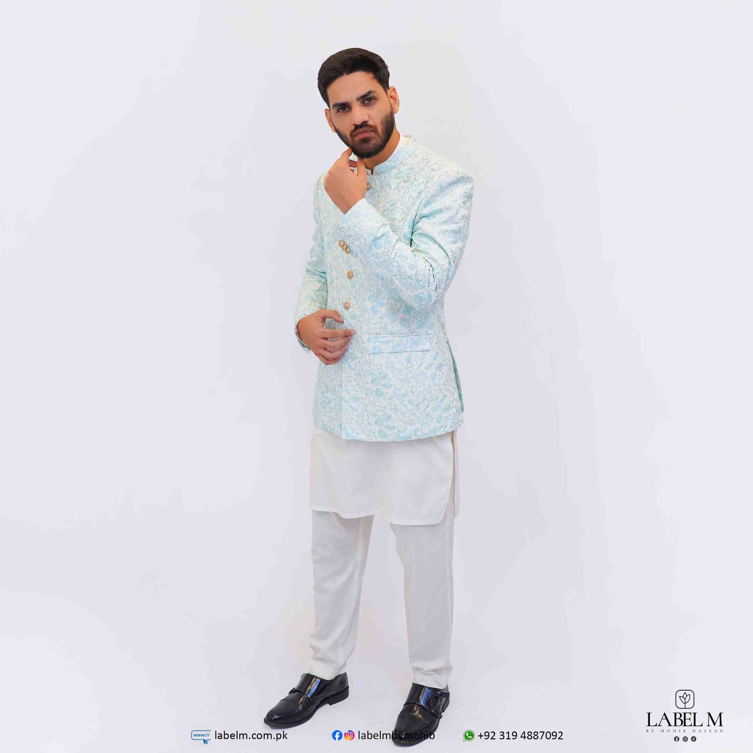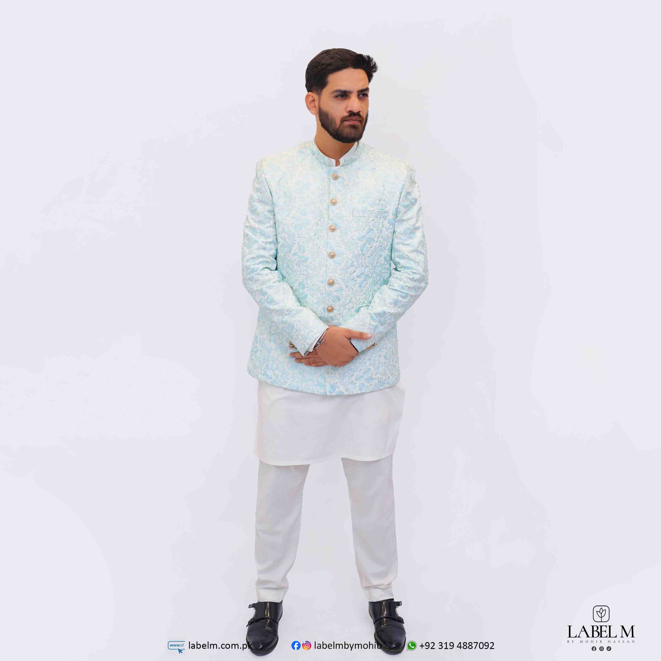 This elegant prince coat features a stunning ice blue color with delicate white embroidery, creating a sophisticated and regal look. The high-quality materials used ensure both comfort and durability, making it perfect for special occasions or formal events. The intricate detailing adds a touch of luxury, making this coat a standout piece in any wardrobe.