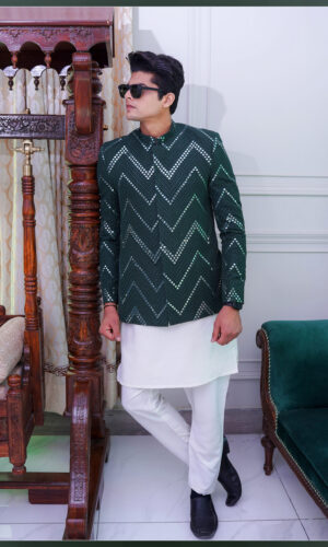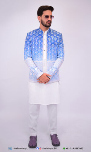 This light apricot embroidered jamawar prince coat exemplifies elegance and sophistication, making it a perfect addition to any formal wardrobe.