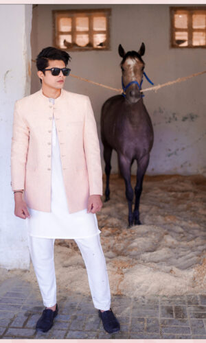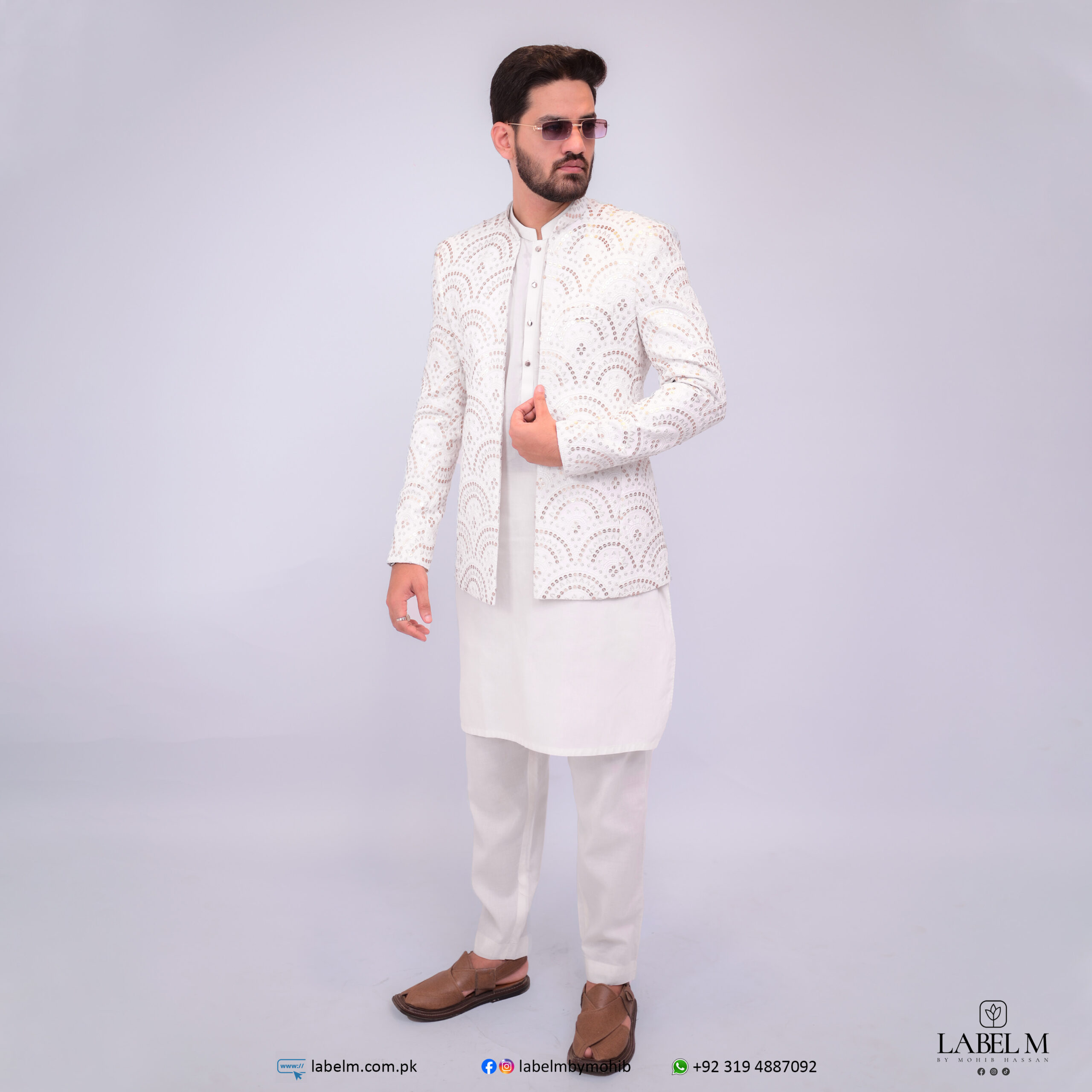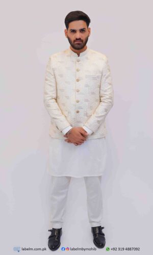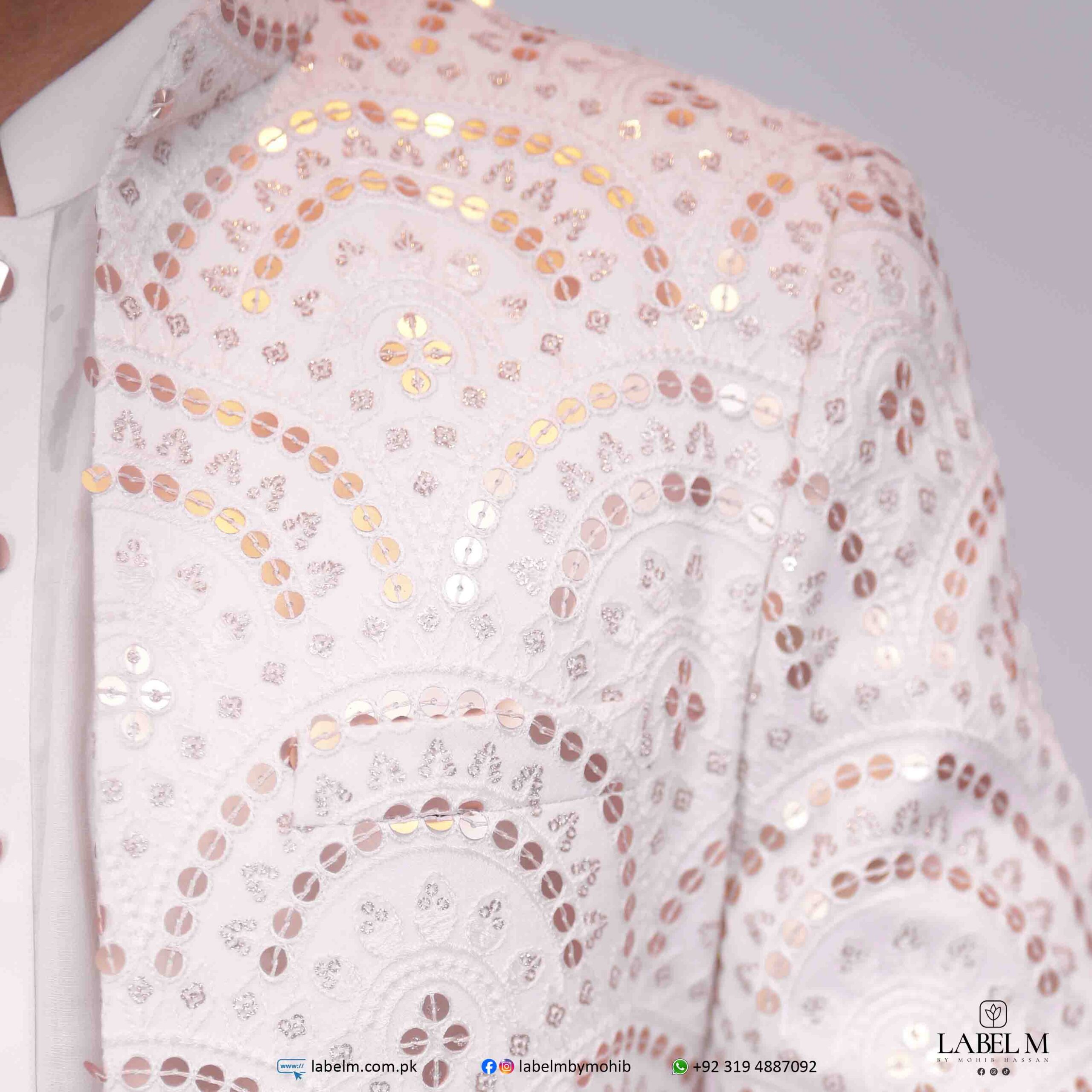 The off white color adds a touch of refinement, while the golden sequins embroidery adds a hint of opulence. Whether you’re attending a wedding, gala, or any other upscale affair, this coat will undoubtedly set you apart from the crowd.
